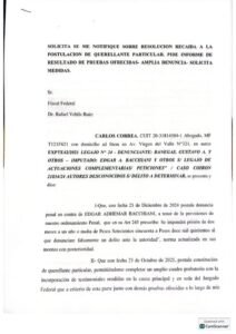 En ese contexto, el denunciante aseguró que existen elementos que permitirían sostener la materialidad del hecho y avanzar hacia una imputación formal. Asimismo, solicitó ser admitido como querellante particular, lo que le permitiría intervenir activamente en el proceso, aportar pruebas y participar de las distintas etapas de la investigación.