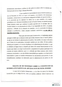 Con el objetivo de esclarecer estos puntos, la presentación solicita una serie de medidas de prueba. Entre ellas se incluyen inspecciones oculares sobre los inmuebles mencionados, pedidos de informes al Registro de la Propiedad Inmobiliaria y requerimientos a empresas de correo para reconstruir eventuales comunicaciones vinculadas con operaciones patrimoniales.