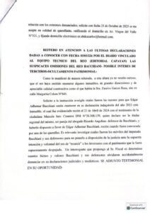 Correa resalta en su presentación y hace referencia a las últimas declaraciones dadas a conocer con fecha 3 de marzo de 2026 por el diario vinculado al equipo técnico del reo (Editorial Capayán), las suspicaces omisiones del reo Edgar Adhemar Bacchiani, lo que podría evidenciar la existencia de un posible interés de terceros y eventuales maniobras de ocultamiento patrimonial.