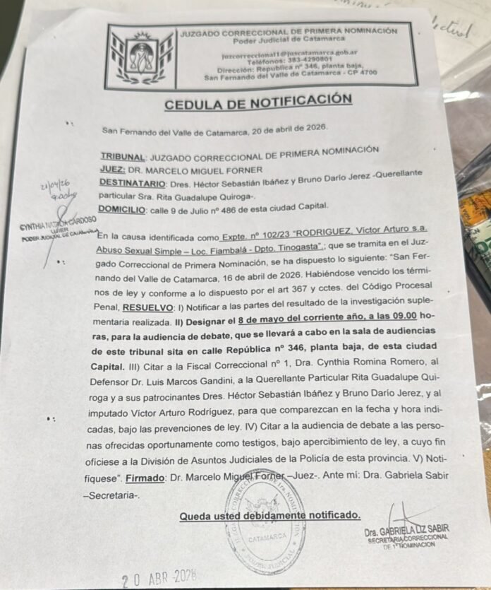 La decisión se produce luego de que la querella solicitara formalmente que se establezca el cronograma del juicio oral, en una causa que investiga a Rodríguez por el delito de abuso sexual simple ocurrido en la localidad de Fiambalá, departamento Tinogasta. El expediente se encontraba en condiciones de avanzar a debate tras cumplirse las etapas procesales previas.
