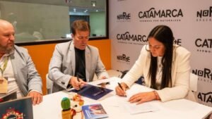 La secretaria de Gestión Turística de Catamarca, Evangelina Quarín, junto al presidente de FAEVYT, Andrés Deyá, el vicepresidente primero, Ezequiel Barberi, y Cristian Fernández, presidente de la Asociación de Agencias de Viajes y Turismo de Catamarca, sellaron un convenio de cooperación para promover la inscripción de las agencias locales en el registro y fomentar la profesionalización, la transparencia y las buenas prácticas en el sector turístico catamarqueño.