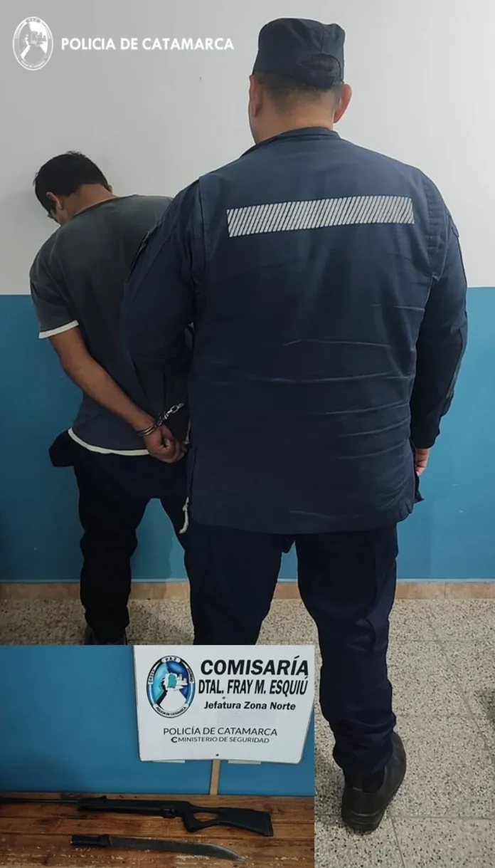 Los efectivos procedieron con el arresto de un hombre de 36 años quien habría amenazado a su pareja con un rifle de aire comprimido y un machete, que fueron secuestrados. Por lo sucedido, el sujeto fue trasladado y alojado en la dependencia policial, tomando intervención la Fiscalía de Instrucción del Distrito Este, desde donde se indicaron las directivas a seguir.